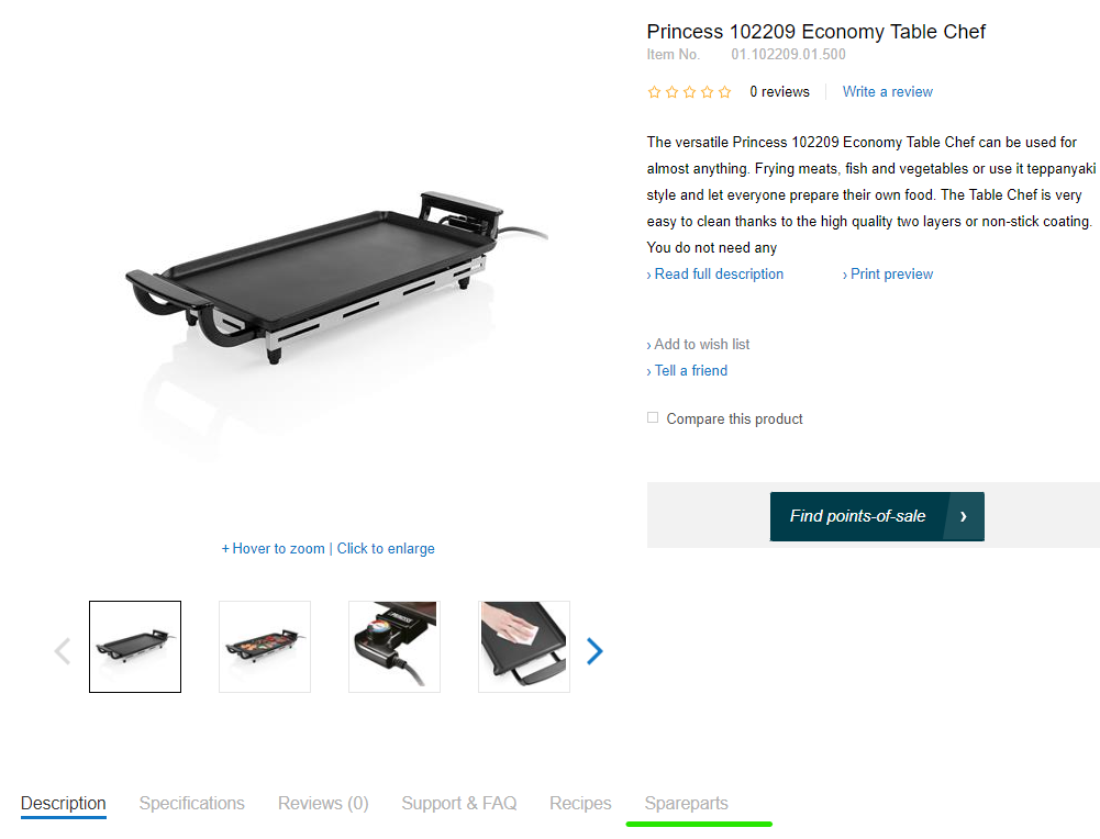 È anche possibile cercare i pezzi di ricambio tramite i prodotti sul sito web; quando inserisci il numero dell'articolo del tuo prodotto Princess, verrai indirizzato alla pagina del prodotto del tuo articolo. Qui puoi anche scorrere verso il basso e trovare la sezione "Pezzi di ricambio". Qui troverai una panoramica di tutti gli accessori e i pezzi che appartengono a questo prodotto.